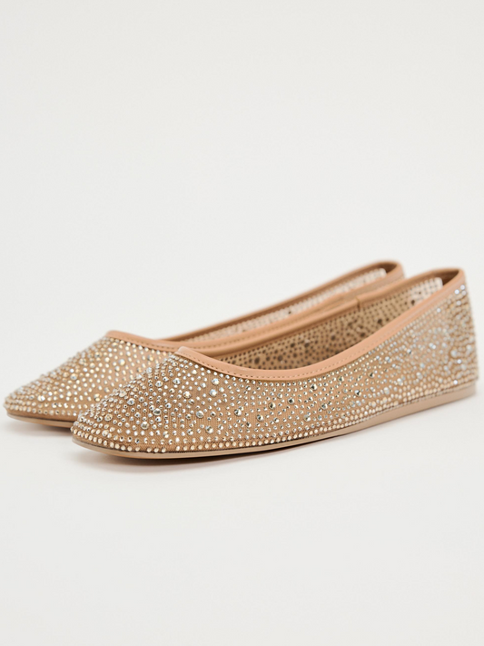 Nude Shiny Full-Embellished Rhinestone Strass Mesh Ballet Flats