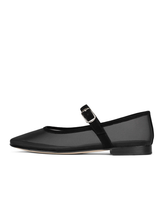 Black Mesh Mary Janes Flats With Faux Suede Buckled Strap