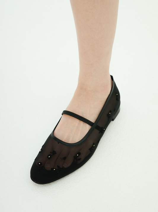Black Floral Embroidered Mesh Flats Mary Janes