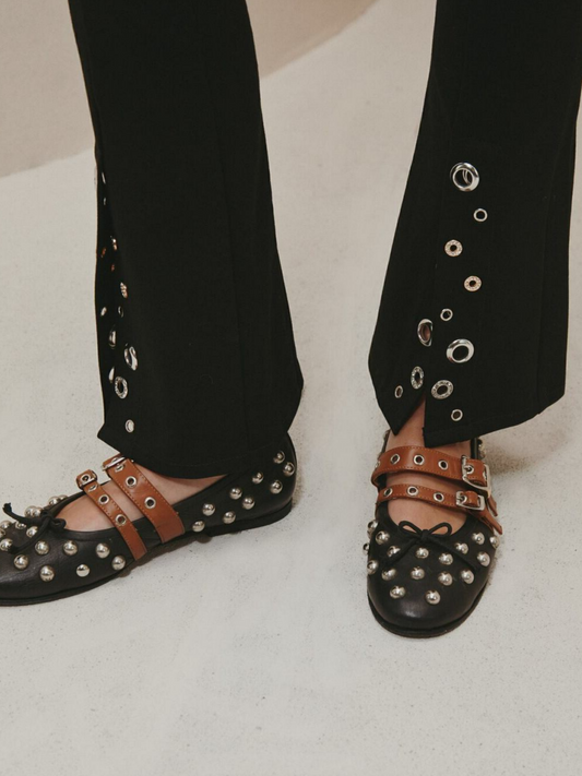 Black Bow Stud Ballet Flats Mary Janes With Grommet Eyelet Buckled Strap