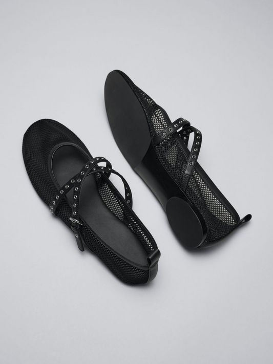 Black Mesh Round Toe Ballet Flats With Crossed Grommet Eyelet Buckled Strap