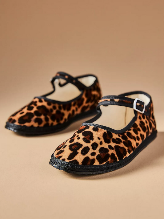 Leopard Velvet Fabric Round-Toe Bridge Buckle Mary Janes Flats