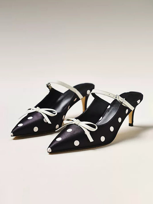 Black Polka Dot Satin Pointed-Toe Bridge Strap Kitten Heels With Bow