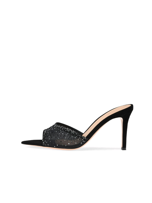 Rhinestones Mesh Open Pointed-Toe Backless Slip-On High Heels – Black