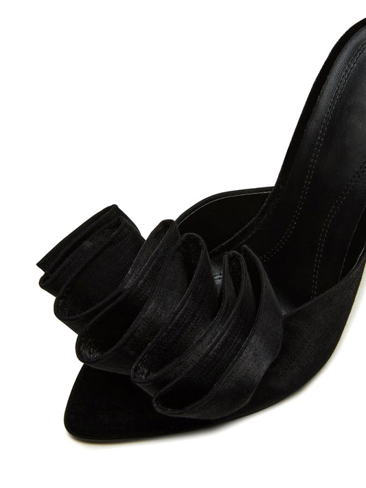 Pointed-Toe Slip-On Pearl Ruffle High Heels - Black Satin