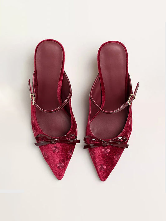 Red Velvet Pointed-Toe Flower Embroidery Patent Bridge Strap Kitten Heels With Bow