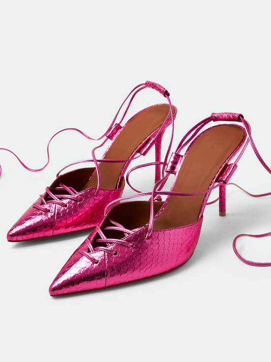 Metallic Pink Snakeskin String Lace Up Gladiators Pointy Stiletto Heels Pumps