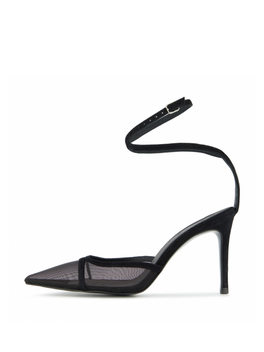 Black Mesh Pointed-Toe High Heels Stiletto Pumps With Ankle Wrap Strap