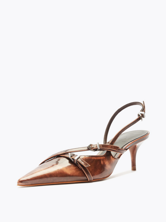 Brown Patent Buckled Strappy Kitten Heels Slingback Courts Scarpin Pumps