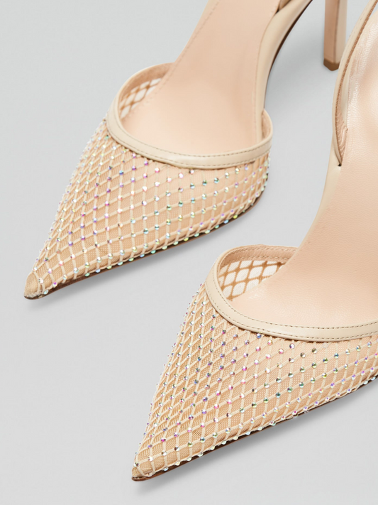 Nude Fishnest Iridescent Rhinestone Pointy Stiletto Slingback Pumps