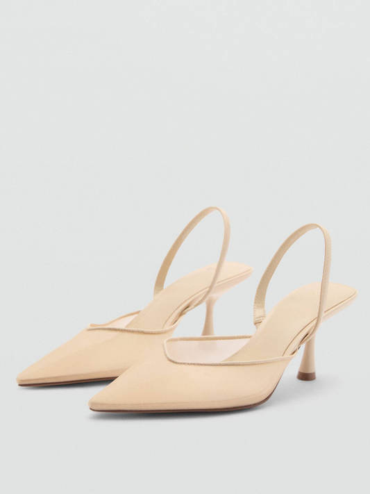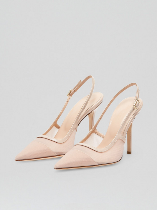 Nude Mesh Pointy Stiletto Heel Slingback Pumps With Buckled Back Strap