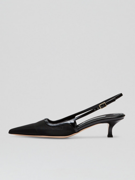 Black Mesh Pointy Kitten Heel Slingback Pumps With Buckled Back Strap