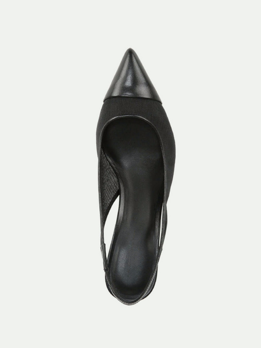 Black Buckle Pointed-Toe Stiletto Heel Slingback Pumps in Mesh & Vegan Leather