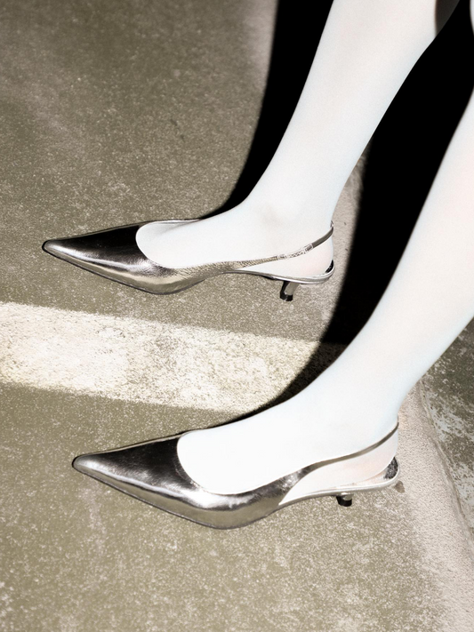 Women Metallic Silver Crinkle Pointy Kitten Heels Slingback Pumps