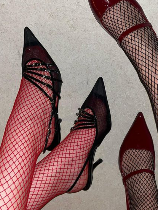 Black Fishnet Rhinestone Buckled Strap Kitten Heels Slingback Pumps