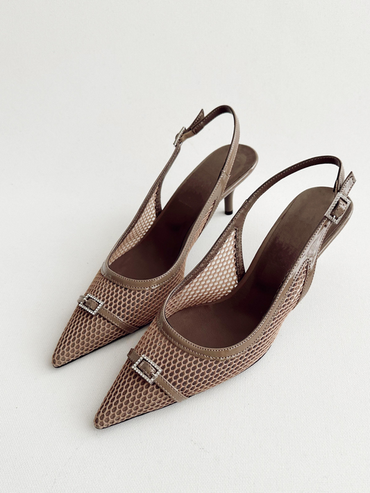 Taupe Fishnet Rhinestone Buckled Strap Kitten Heels Slingback Pumps