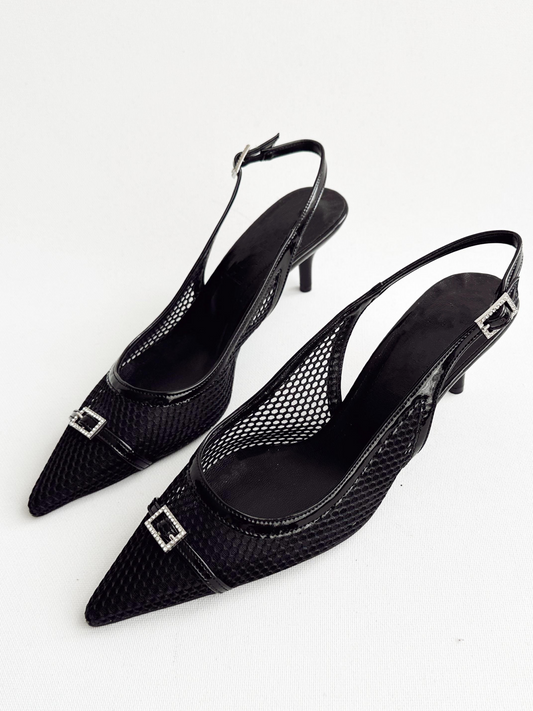 Black Mesh Buckled Multi-Strap Kitten Heels Slingback Pumps