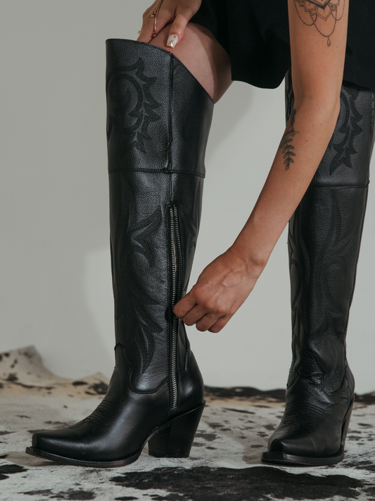 Snip-Toe Embroidery Tall Half-Zip Knee High Cowgirl Boots - Black