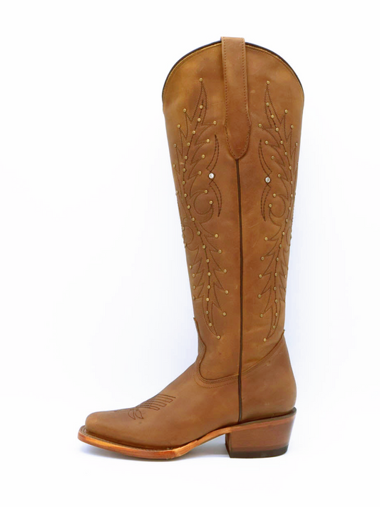 Studded Rhinestone Square-Toe Embroidery Half-Zip Tall Knee High Cowgirl Boots - Brown