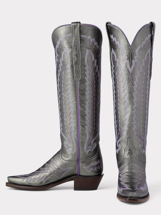 Metallic Pewter Snip-Toe Embroidery Wide Calf Tall Knee High Cowgirl Boots