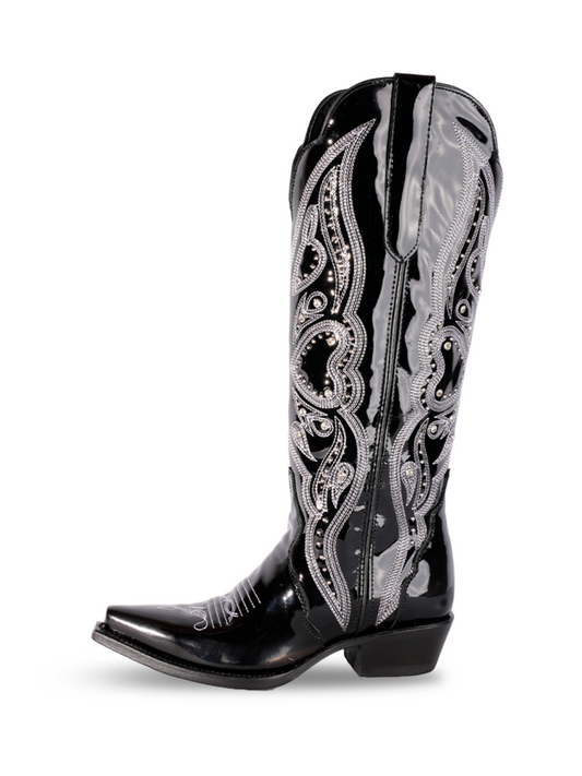 Patent Black Snip-Toe Embroidery Studded Rhinestone Wide Calf Tall Knee High Cowgirl Boots