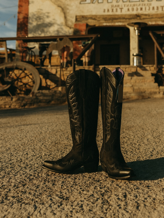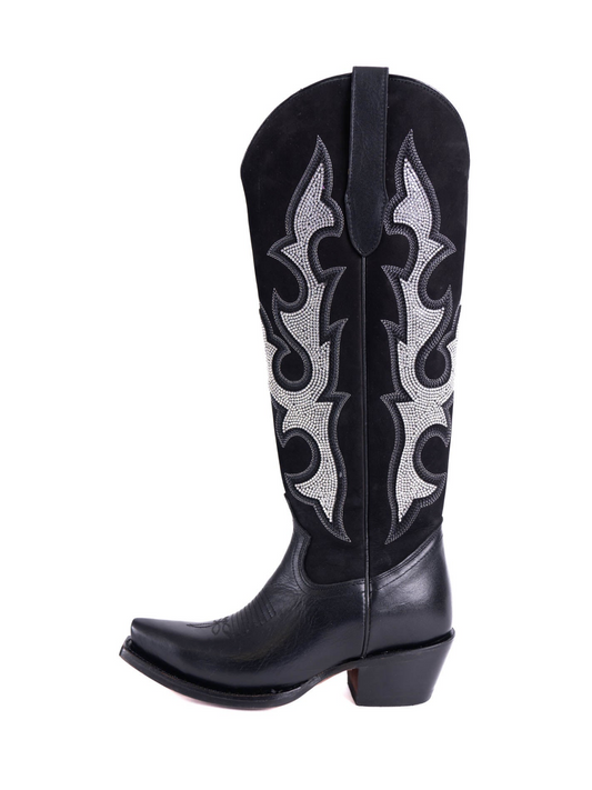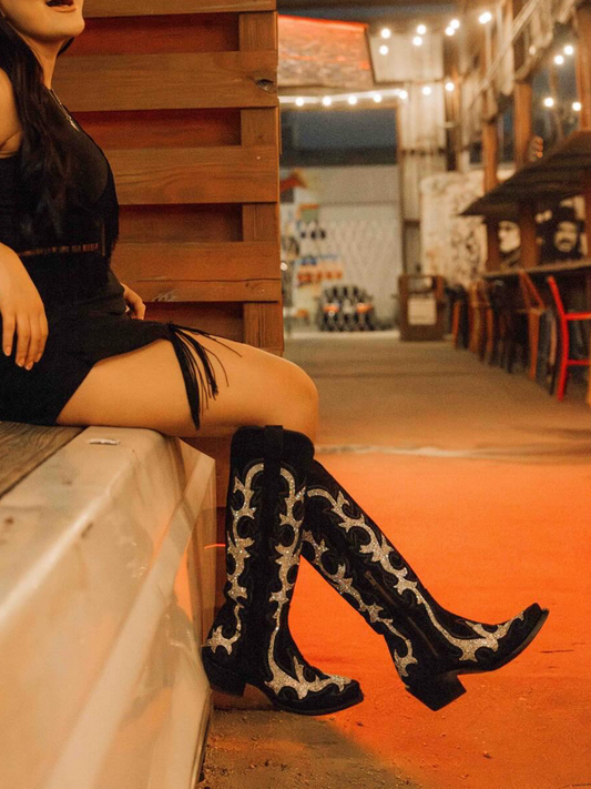 Black Rhinestone Embroidery Snip-Toe Half-Zip Knee High Tall Cowgirl Boots