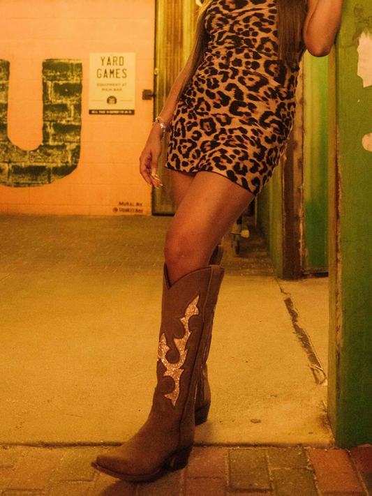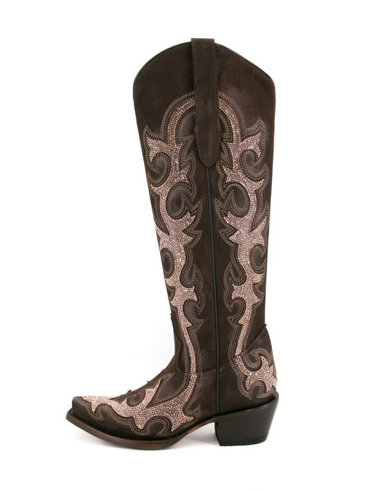 Rhinestone Embroidery Snip-Toe Half-Zip Knee High Tall Cowgirl Boots - Brown