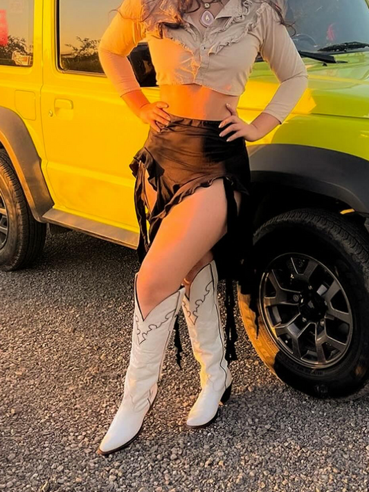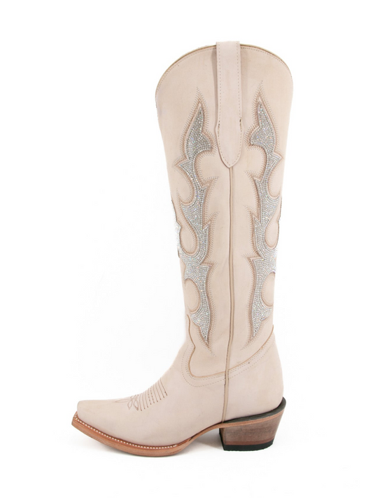 Bone Rhinestone Embroidery Snip-Toe Half-Zip Knee High Tall Cowgirl Boots