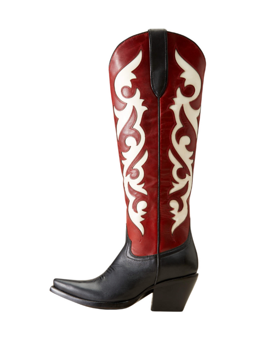 Contrast Red And Black Snip-Toe White Inlay Wide Calf Tall Knee High Cowgirl Boots