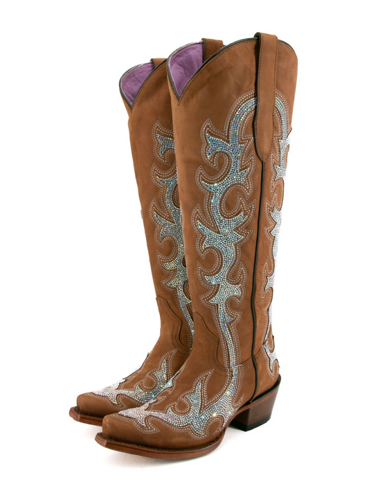 Honey Rhinestone Embroidery Snip-Toe Half-Zip Knee High Tall Cowgirl Boots