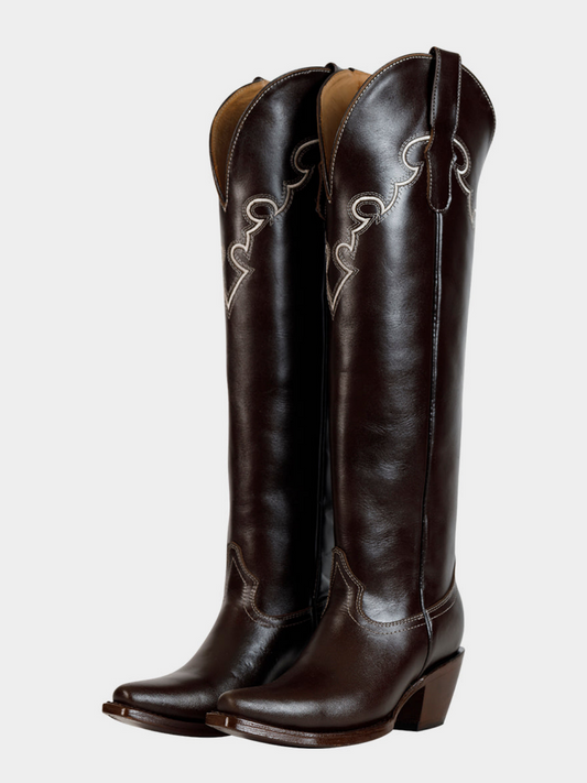 Coffee Brown Snip-Toe Embroidery Wide Calf Tall Knee High Cowgirl Boots