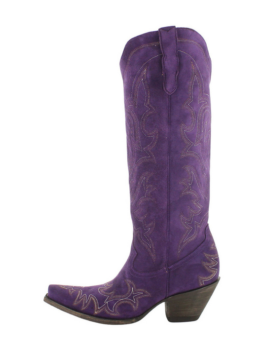 Purple Faux Suede Embroidery Snip-Toe Half-Zip Knee High Tall Cowgirl Boots