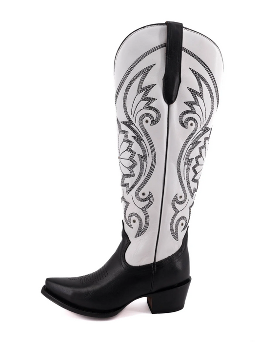 Contrast Black And White Embroidery Rhinestone Snip-Toe Half-Zip Cowgirl Knee High Tall Boots