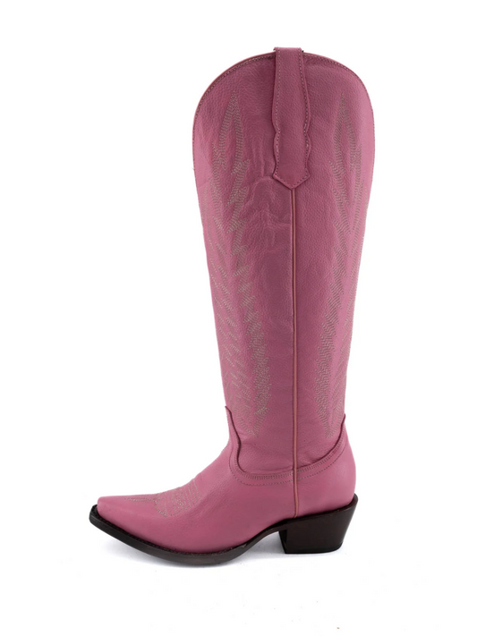 Pink Embroidery Snip-Toe Half-Zip Western Knee High Tall Boots