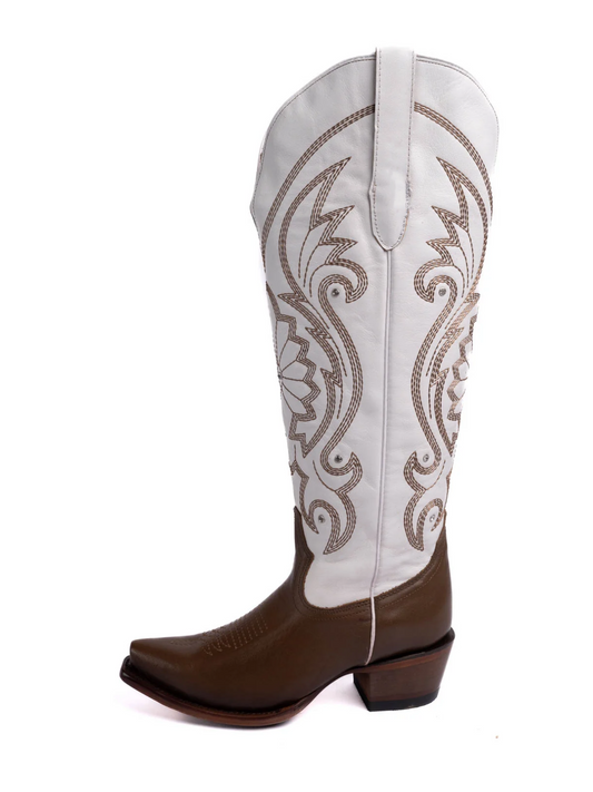 White Embroidery Snip-Toe Half-Zip Knee High Cowgirl Tall Boots