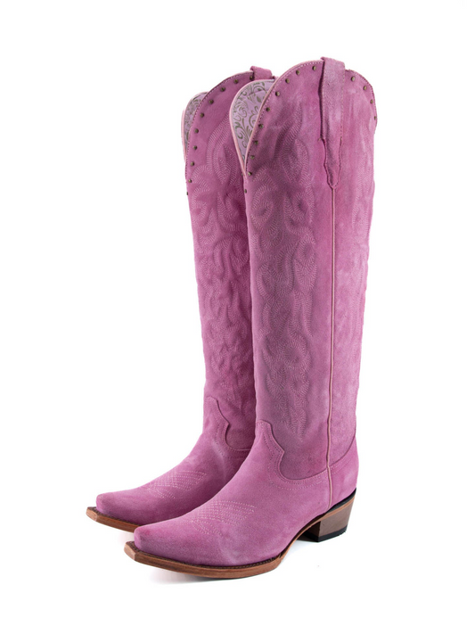 Purple Faux Suede Studded Embroidery Snip-Toe Half-Zip Cowgirl Knee High Tall Boots