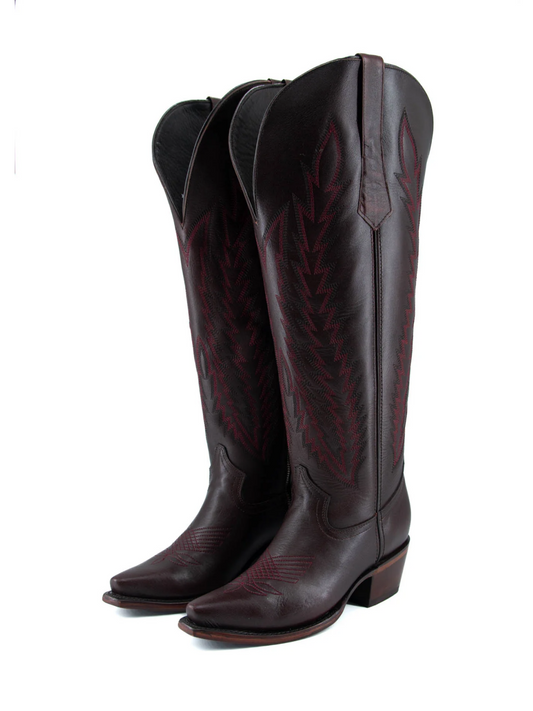 Chocolate Snip-Toe Embroidery Half-Zip Cowgirl Knee High Tall Boots