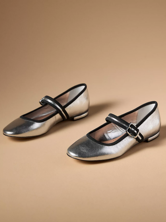 Metallic Silver Square-Toe Bridge Strap Mary Janes Ballet Flats