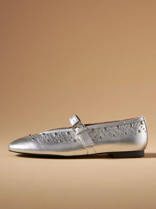 Square-Toe Studded Ballet Mary Janes Flats - Metallic Silver