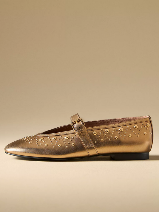 Square-Toe Studded Ballet Mary Janes Flats - Metallic Gold