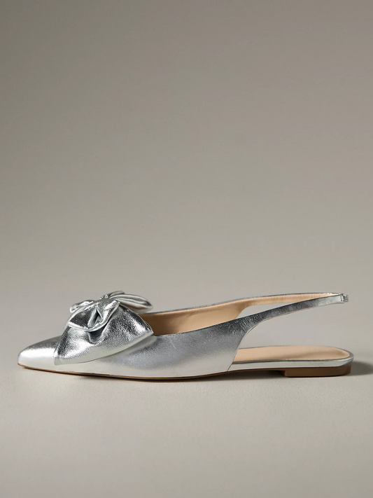 Metallic Silver Pointed-Toe Bow Slingback Flats