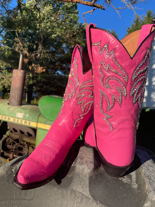 Hot Pink Rhinestone Embroidery Snip-Toe Mid Calf Cowgirl Boots
