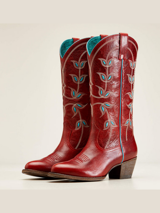 Flame Red Floral Embroidery Almond-Toe Wide Mid Calf Cowgirl Tall Boots