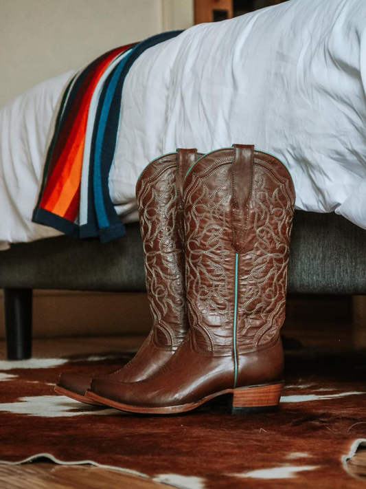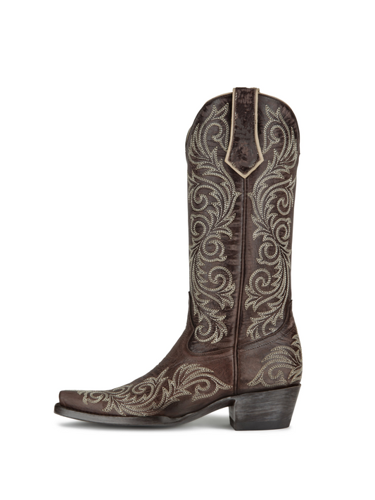 Chocolate Snip-Toe Embroidery Wide Mid Calf Cowgirl Tall Boots