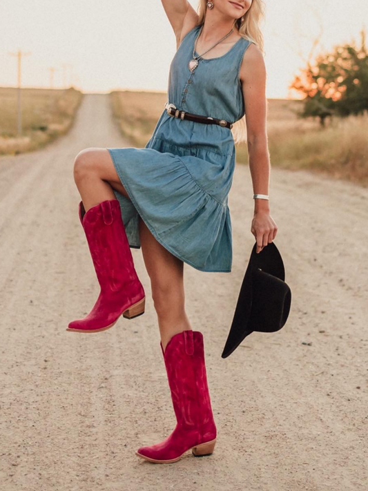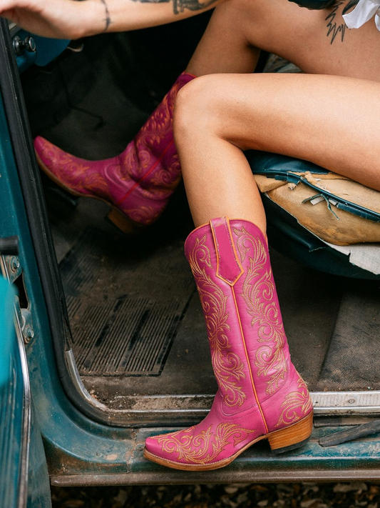 Pink Snip-Toe Embroidery Mid Calf Cowgirl Tall Boots