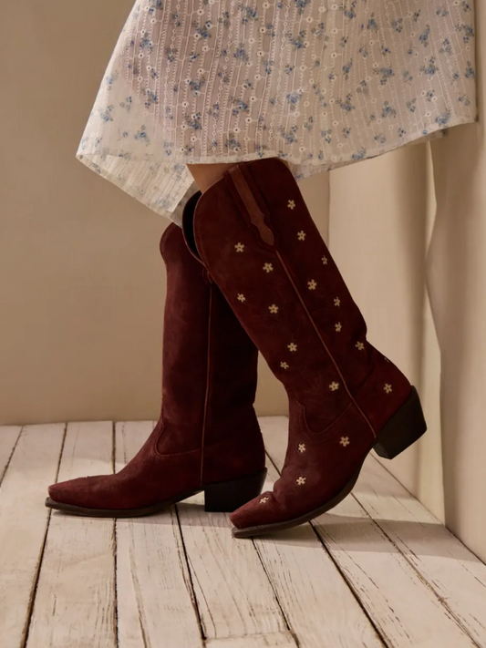 Brick Red Faux Suede Snip-Toe Wide Mid Calf Cowgirl Tall Boots With White Floral Inlay