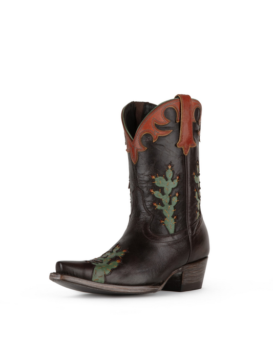 Chocolate Snip-Toe Wide Mid Calf Cowgirl Boots With Cactus Inlay And Applique