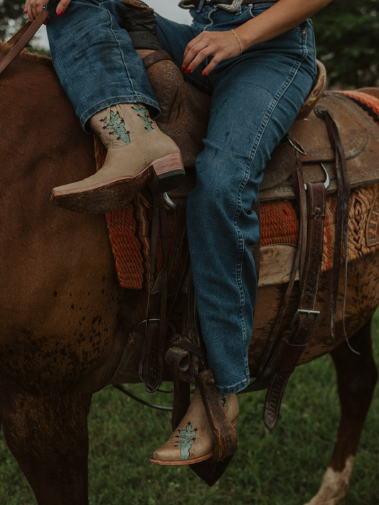 Tan Snip-Toe Wide Mid Calf Cowgirl Boots With Cactus Inlay And Applique