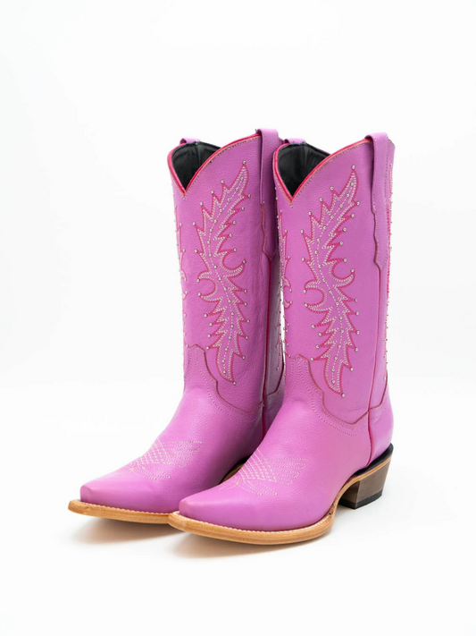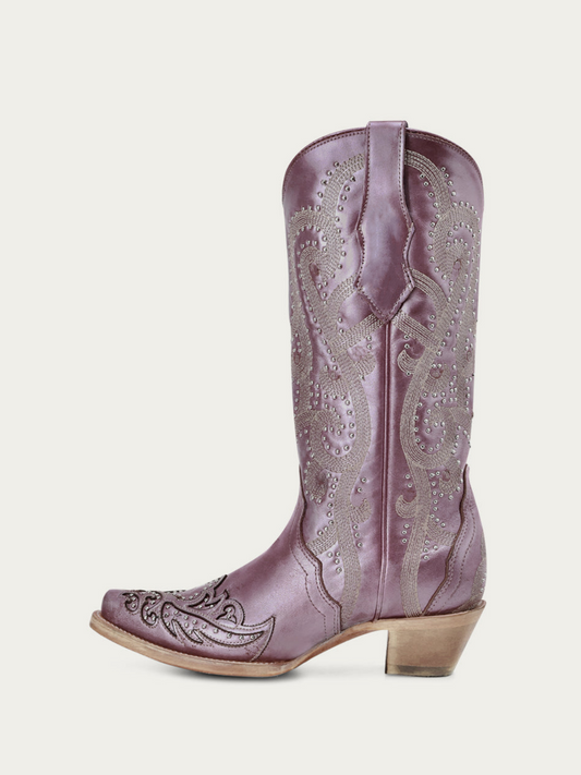Lavender Pink Embroidery Studded Snip-Toe Wide Mid Calf Cowgirl Tall Boots