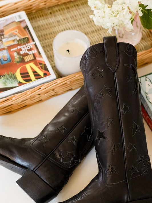 Moon Star Inlay Applique Mid Calf Cowgirl Tall Boots - Black